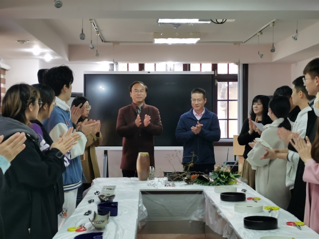 最后指导老师做点评,拍照留念。谭芳其表示,花道是一种集修身、社交、技艺等多个文化领域于一身的艺术,集中反映了人的自然观念、美育意识和伦理观念,对了解日本文化有很大的帮助。 此次活动使大家对插花艺术有了更多了解,在实践过程中提高了审美能力,陶冶了情操,增强了对国际文化的了解。
